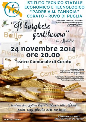 Rivisitato dai ragazzi dell’ITSET “Tannoia” di Corato, sarà in scena al Teatro comunale di Corato “Il borghese gentiluomo” di Molière. Gli alunni hanno lavorato sia nell’ambito teatrale che musicale sul famoso testo del grande artista francese con la libertà che deriva dalla conoscenza e dall’esperienza. La conoscenza approfondita del testo e l’esperienza dei Laboratori di Teatro e Musica del “Tannoia” di Corato che nel tempo hanno saputo realizzare una autorevole tradizione interpretativa nell’ambito educativo e formativo, portando sulla scena opere di grandi Autori e opere originali e di taglio contemporaneo. E la messinscena del “Borghese gentiluomo” è appunto una dimostrazione della capacità di trasporre un testo antico in una chiave di lettura attuale. Il connubio tra le arti e le espressioni della parola, della musica e della rappresentazione, realizza sempre, grazie ai due Laboratori del “Tannoia”, uno spettacolo vivo e nuovo nella ideazione e nella messinscena. Il percorso che ha portato alla realizzazione dello spettacolo ha coinvolto studenti delle classi prime, seconde, terze, quarte e quinte dell’Istituto in un progetto finalizzato all’inclusione scolastica. I corsi di musica e di teatro sono stati tenuti dai Maestri Tommaso Scarabino e Francesco Martinelli, referenti i docenti Rosanna Falco, Domenico Capozza, Sergio Falleti. L’esibizione teatrale-musicale si terrà lunedì 24 novembre alle ore 20.00 presso il Teatro comunale di Corato: il Dirigente Scolastico prof. Giovanni De Nicolo invita la comunità scolastica e la cittadinanza a partecipare. |