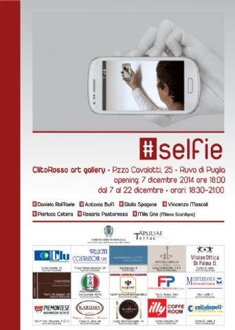 A Ruvo di Puglia, dal 7 al 22 Dicembre 2014 presso la CLITOROSSO ART GALLERY, sette artisti Pierluca Cetera, Antonia Bufi,RosariaPastoressa,VincenzoMascoli,GiulioSpagone,MilaGno (Milena Scardigno)e Daniela Raffaele(Clitorosso)presenteranno opere di stili e forme diverse, raccontando, attraverso l’arte, il fenomeno sociale moderno dei selfies, come manifestazione e partecipazione di una nuova forma di comunicazione e di linguaggio. Ciascuno di loro espone un lavoro, testimonianza singolare, del nuovo concetto di io e di individualità che scaturisce dalla società contemporanea, dominata dai social media, trasformando il pubblico da ricettore passivo dell’opera d’arte, a creatore attivo. Vernissage: 7 dicembre 2014 ore 18.00 c/o la ClitorossoDR Art Gallery, P.zza Felice Cavallotti 25-26 a Ruvo di Puglia .Durante la serata, ci sarà l’intervento della Dott.ssa Liliana Bellavia (psicologa-psicoterapeuta Specialista in terapia relazionale sistemica) e la performance a cura di Giulio Spagone .La mostra sarà aperta dal 7 al 22 dicembre 2014, tutti i giorni, dalle 18:30 alle 21:00. Con il patrocino del Comune di Ruvo di Puglia e l’Assessorato alla Cultura;in collaborazione con l’Ass. Apuliae Terrae |