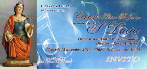 Si svolgerà Venerdì 12 Dicembre, presso la Chiesa a lei dedicata, il "Concerto Lirico Sinfonico in onore di Santa Lucia". L'Orchestra di Fiati "Basilio Giandonato" sarà diretto dal M° Rocco Di Rella, e l'inizio sarà alle ore 19.30. Per il secondo anno consecutivo la Chiesa di Santa Lucia di Ruvo di Puglia organizza questo concerto. Si spera in una buona presenza da parte della cittadinanza. |